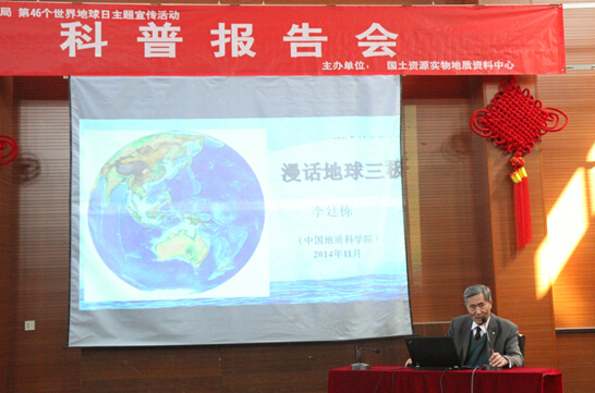 4月22日,实物中心“第46个世界地球日”主题周活动迎来了最高峰,围绕2015年地球日 “珍惜地球资源 转变发展方式——提高资源利用效益” 这一活动主题,实物中心邀请到了我国著名的地质学家、中国科学院李廷栋院士作题为《漫话地球三极》的科普报告。北京大学地空学院、中国地质大学(北京)、华北科技学院、防灾科技学院近300位师生参加了本次报告会。