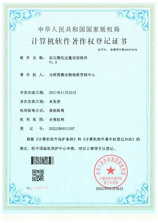 《岩石颜色定量化识别软件》(证书号:软著登字第8985706号)基于色度学原理,利用岩石的光谱特性,在可见光波段实现了岩石颜色的数值定量化和批量自动计算。该软件可支持多个颜色系统,实现了岩石颜色的快速高效、客观识别与数值定量化表征,为地质编录、沉积环境研究等方面提供了重要依据。