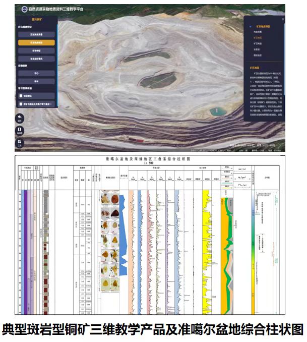 为提升服务支撑能力,实物资料中心围绕找矿热点及高频需求,选取代表性的岩心资料开展深度研究,形成系列专题产品,精准匹配用户多元化应用场景。针对地质教学需求,结合《矿床学》教材,融合现代信息技术与卫星遥感数据,研发典型斑岩型铜矿三维教学产品并形成专题课程,有力支撑专业人才培养;针对油气勘查需求,开发准噶尔盆地及周缘地区中生界“铁柱子”产品,通过集成区域内钻井数据构建了多参数柱状图,在此基础上开展恢复古气候、厘定重大地质事件等地学研究工作,为油气资源潜力评价提供科学依据。