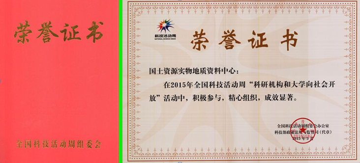 鉴于地调局实物资料中心在2015年全国科技活动周宣传活动中,积极参与,精心组织,成效显著,2015年5月荣获全国科技活动周组委会和科技部政策法规与监督司颁发的荣誉证书。