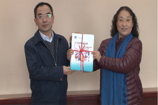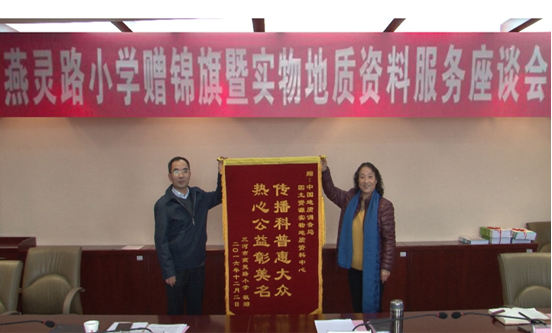 会上,江云华主任简单介绍了实物地质资料中心科普工作基本情况以及科普活动取得的成绩。燕灵路小学校长贾凤玲对实物中心为小学生们提供的实物地质资料科普服务,给予了高度赞扬和肯定,并代表燕灵路小学向实物资料中心赠送“传播科普惠大众,热心公益彰美名”锦旗。实物资料中心主任江云华代表实物中心向燕灵路小学赠送了《十个伙伴来分级》、《趣话实物地质资料》科普读物。