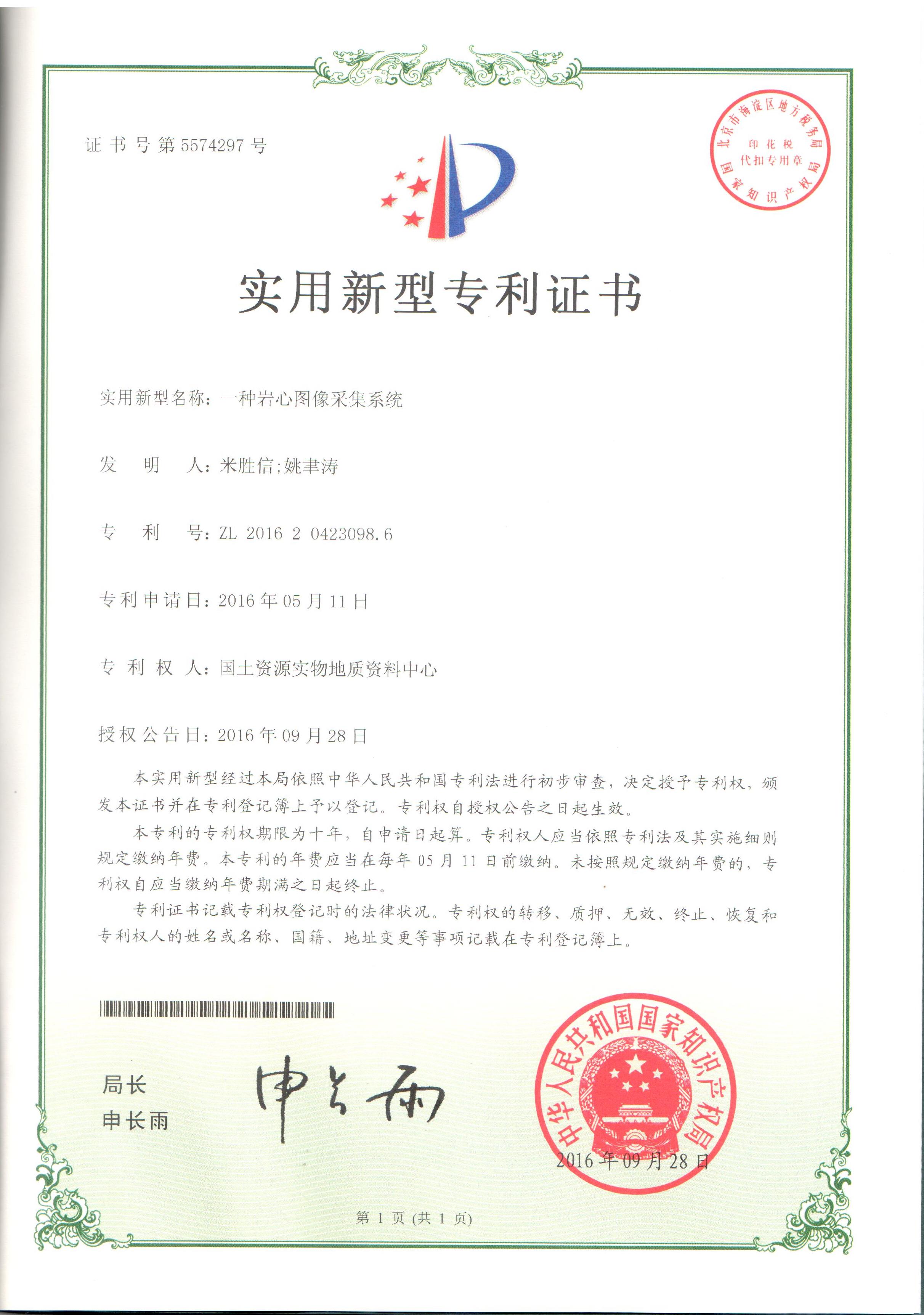 日前,国土资源实物地质资料中心研发的“一种岩心图像采集系统”专利获得国家实用新型专利授权,专利号:ZL 2016 2 0423098.6。 该专利是一种岩心图像采集照相装置,主要包括岩心照相支架、图像采集模块和图像处理系统等组成。
