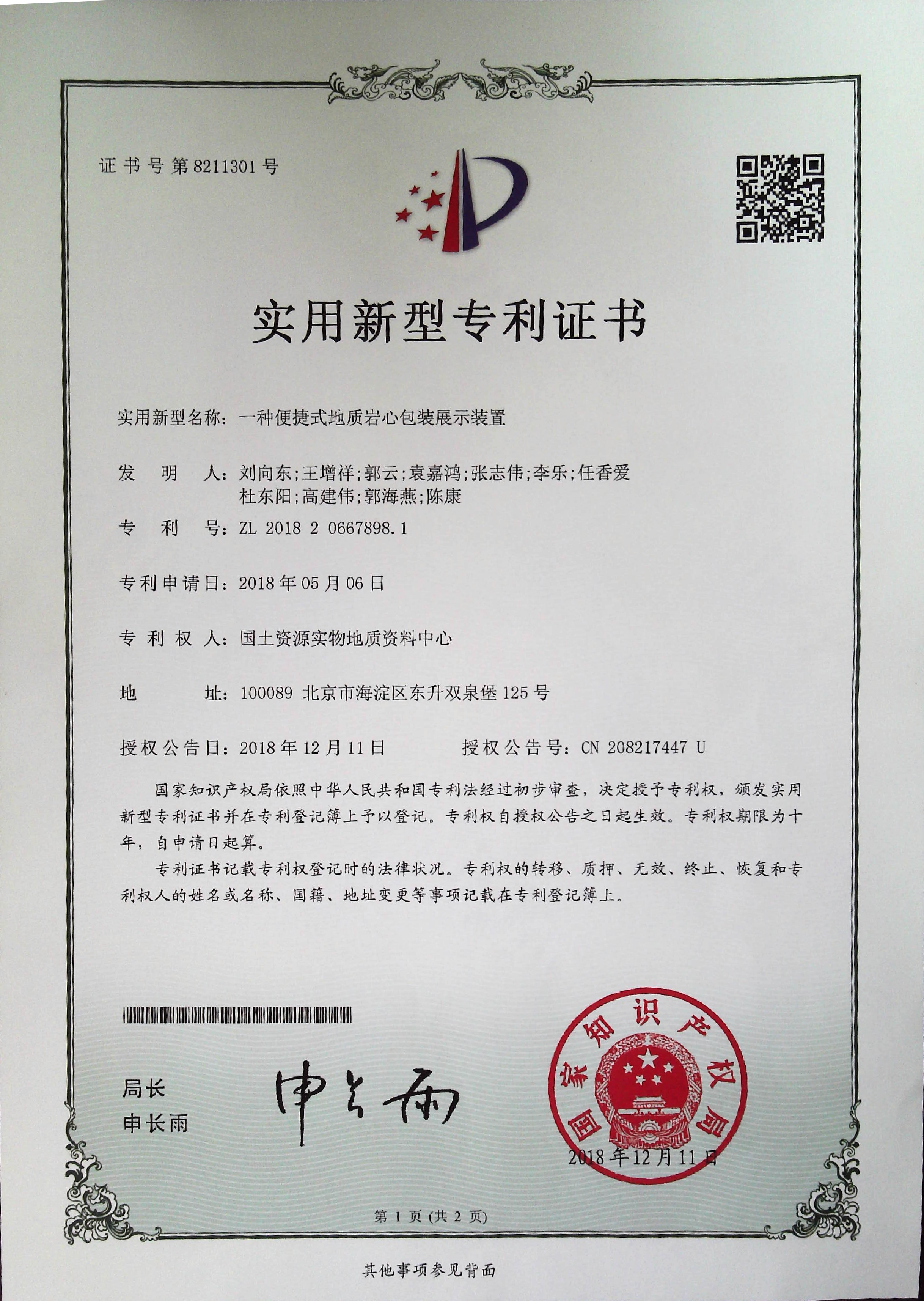 2019年1月,自然资源部中国地质调查局自然资源实物地质资料中心研发的一种便捷式地质岩心包装展示装置获得国家实用新型专利(专利号:ZL 2018 2 0667898.1)。