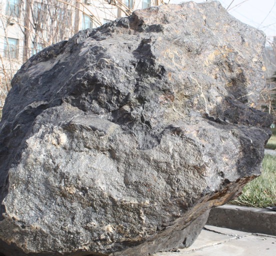 该矿石产自安徽省铜陵市铜山铜矿区的主矿体。标本表面褐色,新鲜面铁黑色,致密块状,坚硬。矿块表面见滑移面上附着中细粒石英脉,脉宽<1㎝。矿石主要金属矿物由铁黑色细鳞片磁铁矿、微细状赤铁矿(粉末暗红色,发育微劈理)和赤铁矿劈理裂隙中浸染状、长条状、扁豆状黄铁矿和黄铜矿组成。矿石中含有稀少的石英细脉。