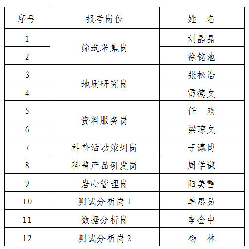 信息技术岗2面试前全部人员放弃面试资格,岩心应用研究岗、岩心数字化 应用研究岗、信息技术岗1参加面试人员均未达到面试合格分数线(80分),故取消上述4个岗位招聘。岩心管理岗计划招聘2人,1名面试人员达到面试合格分数线(80分),列为考察人选。